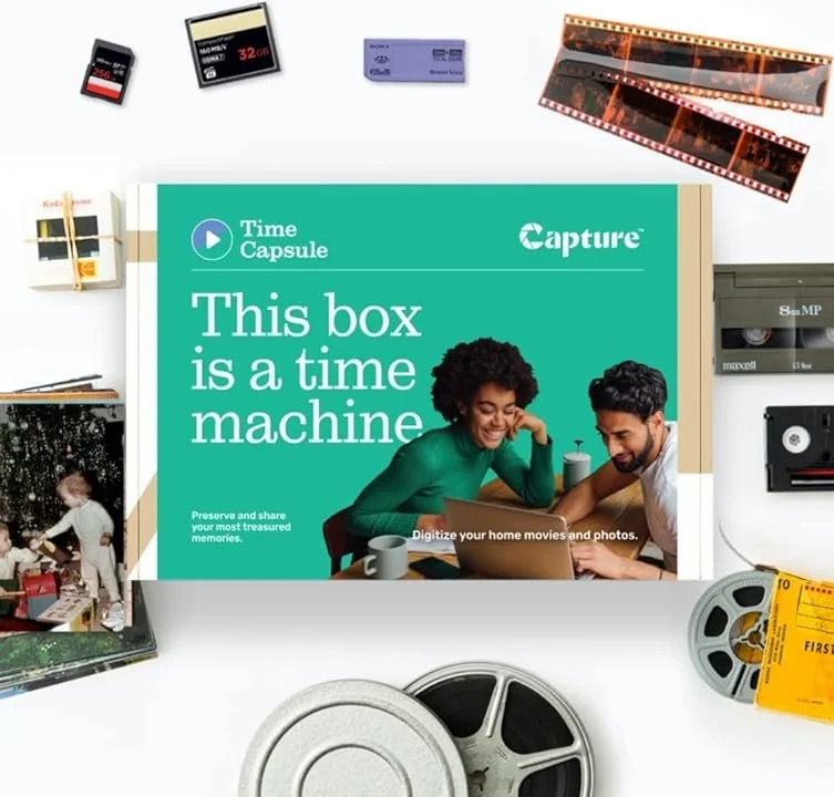 A Capture Time Capsule digitization kit is one of the easiest options. Your recipient just packs up old tapes, film reels, or photos, and sends them in using the included prepaid label. They’ll get digital versions back — perfect for preserving family history.